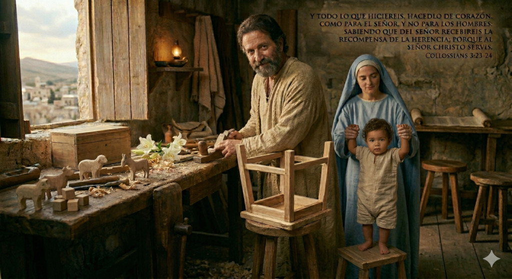 Su trabajo estaba envuelto en este silencio, era un humilde carpintero que bajo el esfuerzo de su trabajo, supo responder con fidelidad el cumplimiento de sus deberes, en un constante servicio.